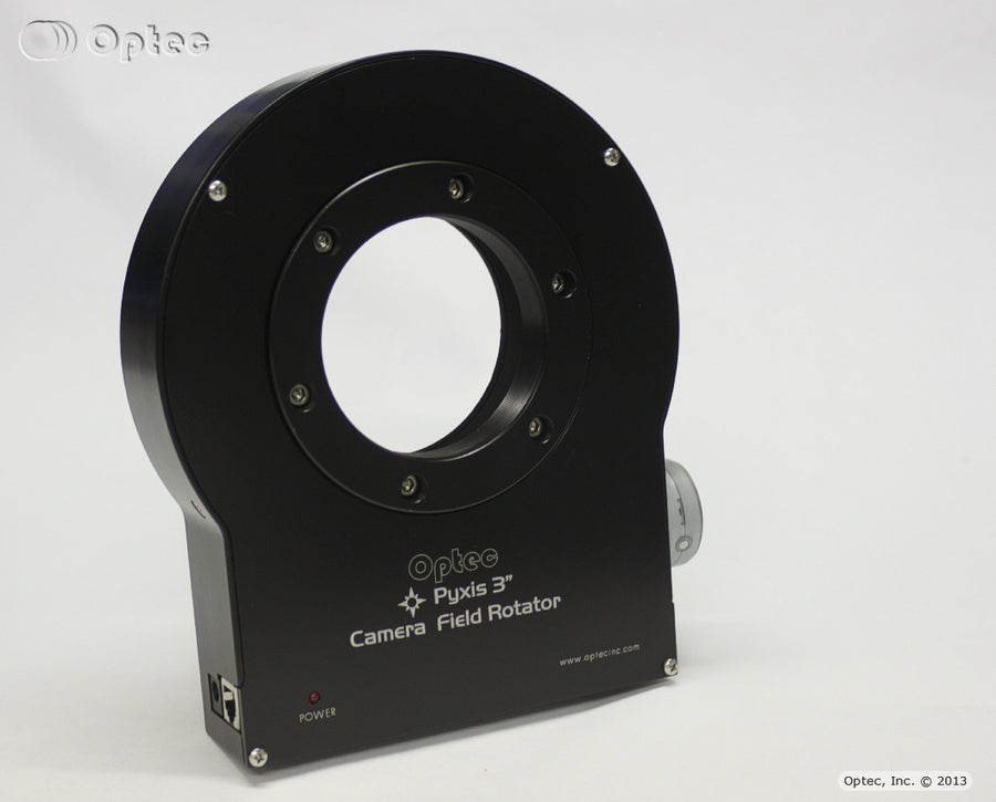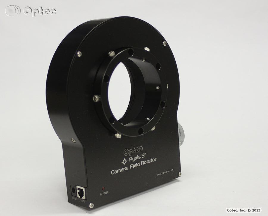 The Pyxis 3-inch has a full 3 inches of clear aperture and is designed to hold large instrument packages without flexure or wobble. A 6-inch bronze worm gear and stainless worm rotate the center tube with a resolution of 0.01875 degree per step from the stepper motor. The Pyxis 3" is compatible with the Optec Alt-Az derotation server allowing for full derotation support. Power requirements and other operating conditions are similar to the 2-inch Pyxis model.